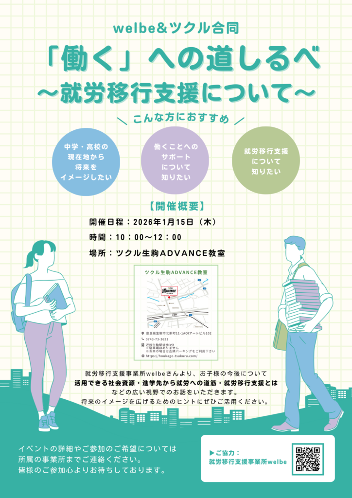当日は、地域で利用できるさまざまな進路の選択肢について、ウエルビー様と一緒にお話しする機会を設けています。中学生・高校生の時期からどのようにつながっていくのか、お子さまのこれからを少し先まで見通しやすくなるような内容を予定しています。
