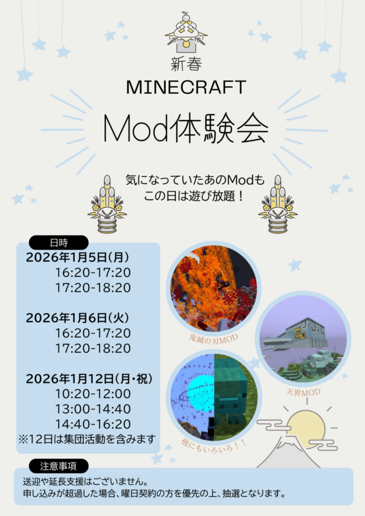 1月5日(月)・6日(火)【新春ミニイベント】マイクラMOD体験デー