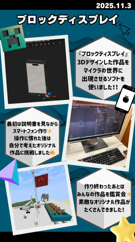 当日は練習として説明書を参考にスマートフォンを作成したのち、オリジナルのアイテムを自由に3Dデザイン!完成後はそれぞれのオリジナル作品をマイクラの世界に出現させ、何を作ったかを発表しています。コマンドブロックから出現した3D作品を見て利用者さんたちから「すごい!」「おー!!」と歓声が上がっていました✨