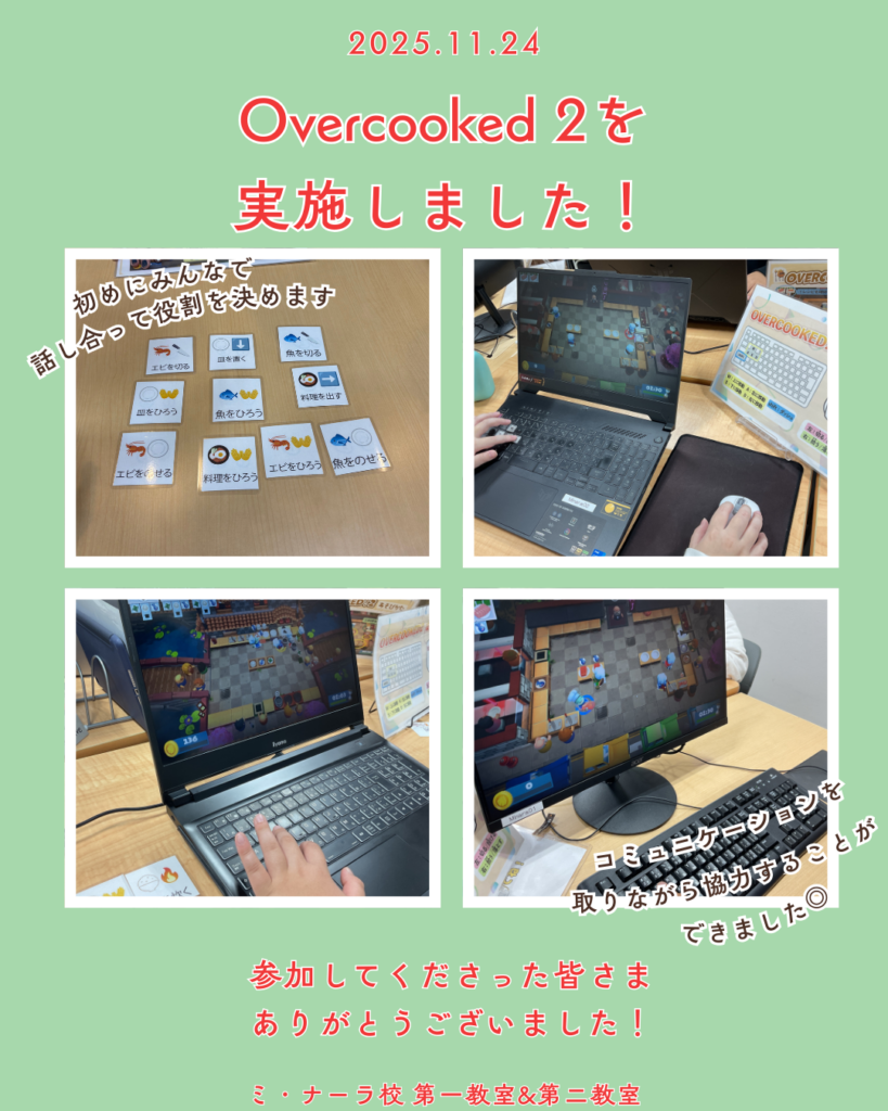 チームで料理を作り、お客さんの注文を時間以内に満たす協力ゲームでした!初めにみんなで相談し、食材を切る番やお皿を洗う番を決めます。プレイ中もみんなで同じ目標に向かって「手伝おうか?」などと声を掛け合いながら取り組むことができていました✨