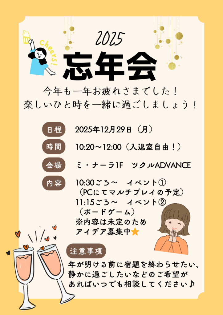 また、年内最後の利用日である12月29日(月)には、忘年会イベントを開催いたします!今年を振り返りながら利用者の皆さんと職員でマルチプレイやボードゲームをして過ごし、楽しく1年を締めくくることができればと思います。少しだけ空きがございますので、今からのお申込みも大歓迎です!いつでもご連絡くださいね(^▽^)/