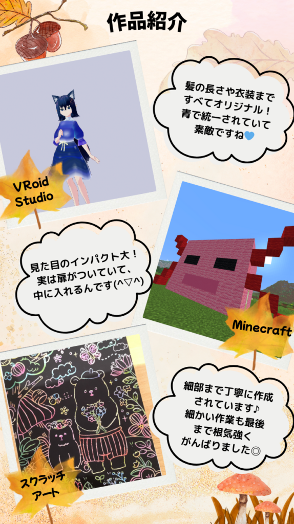上記の作品はテンプレートを使わずすべて手作業で作成を行っています。髪の毛を一本ずつ自然な形で表現することに苦戦していましたが、試行錯誤を繰り返し素敵な作品に仕上がりました♪自宅でもアプリの操作方法について事前に調べてくれていたそうで、成果が発揮されましたね!