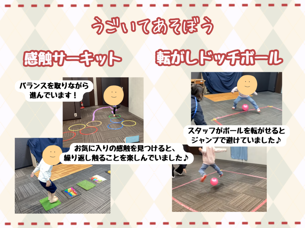 感触サーキットや転がしドッジボールで身体を思いっきり動かしました。