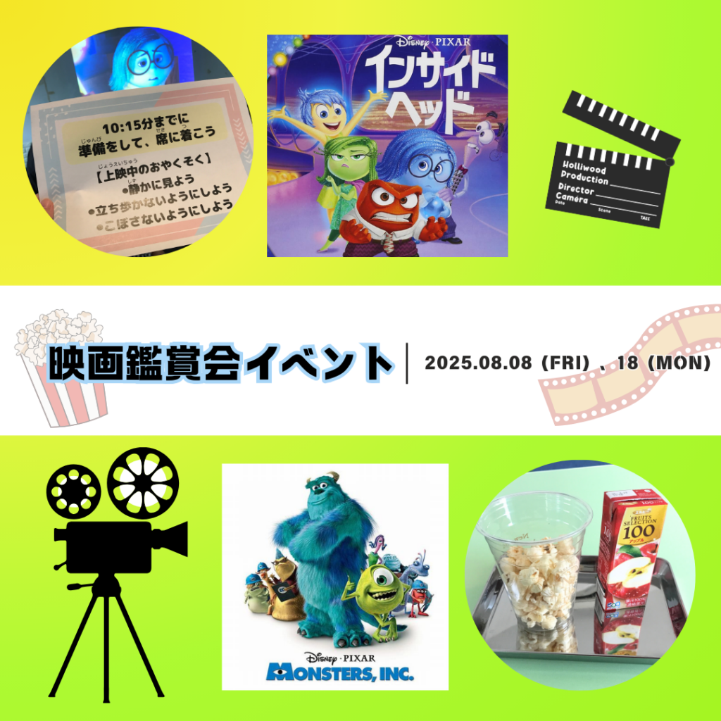 登所準備を行った後に好きな、ポップコーンとジュースをうけとり、8月8日は『インサイドヘッド』、8月18日は『モンスターズインク』をみんなで観ました⭐︎