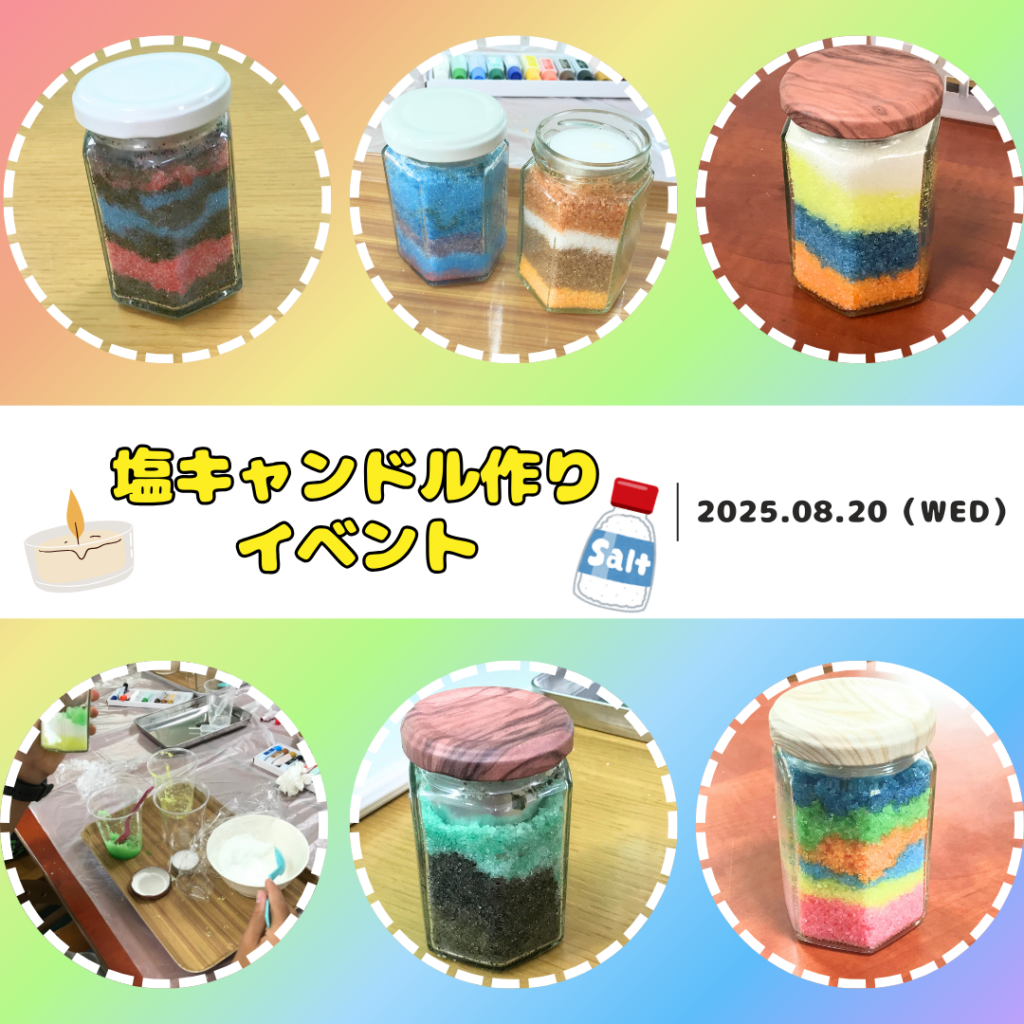 作りたい層をイメージし、絵の具で色を調合してみたり、濃さを調節しながら塩に色を付けました☆ビン詰を行う時は塩の量や入れる色の順番等を考えながら、こぼさないように真剣に行なっています♡大量の塩に「全部使うの?」と驚きながらも楽しんで創作しました♧個性豊かな、素敵な作品がたくさんできました(*’▽’*)