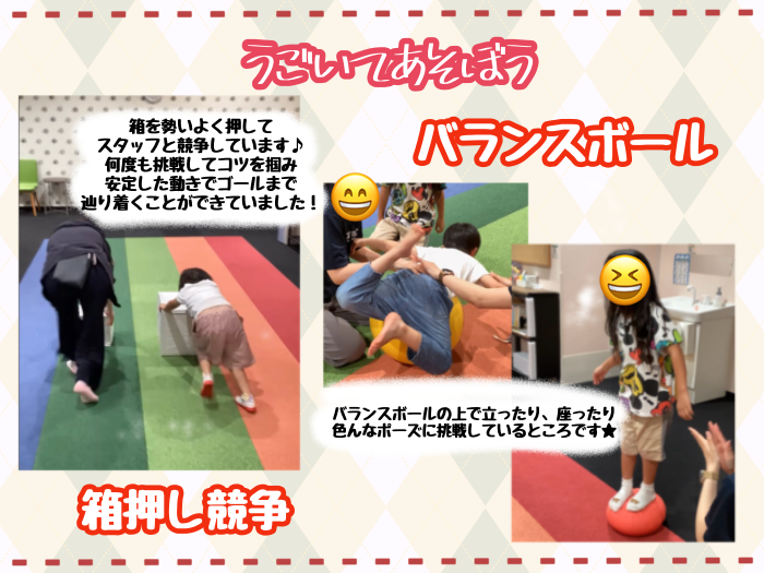 動の活動ではバランスボールや箱押し競争で、元気いっぱい身体を動かしました!