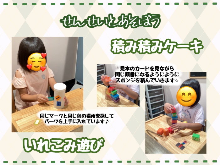 個別の活動では、いれこみ遊びや積み積みケーキを楽しんでいる様子です!